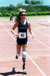 [Photo: Jami Goldman, runner, who lost both her legs to frostbite when she was 19]